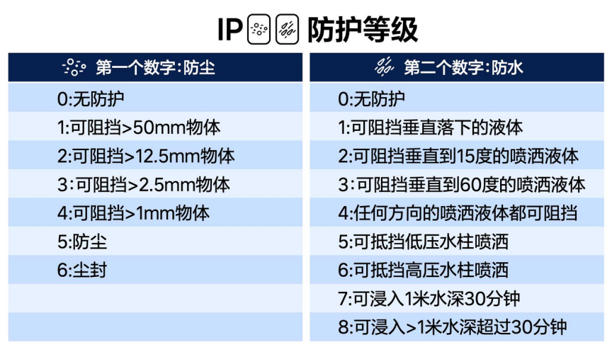 理想 i8 的充电口与充电枪连接后的防护等级为 IP55 等级,这个防护等级可以结合下图来理解。