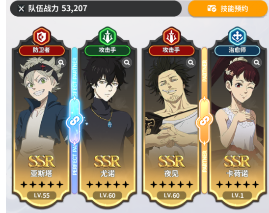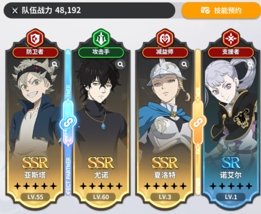 前期阵容不需要纠结,抽卡系统赠送的魔导士凑在一起就是超强的开荒队。具体的搭配自然就是亚斯塔、尤诺、诺艾尔和夏洛特。在队伍中亚斯塔是肉盾担当,自带一个大范围的挑衅技能,可以把敌人的火力全部都引到自己的身上,可以保护队友安心输出。尤诺不仅是一个攻击手,同样也是一个减益师,在输出稳定的同时还可以给敌人挂各种负面效果,可以削弱敌方的战斗力。诺艾尔主打的是防御辅助,可以给队友增加防御buff,让整个队伍的生存能力能大幅度的提升。