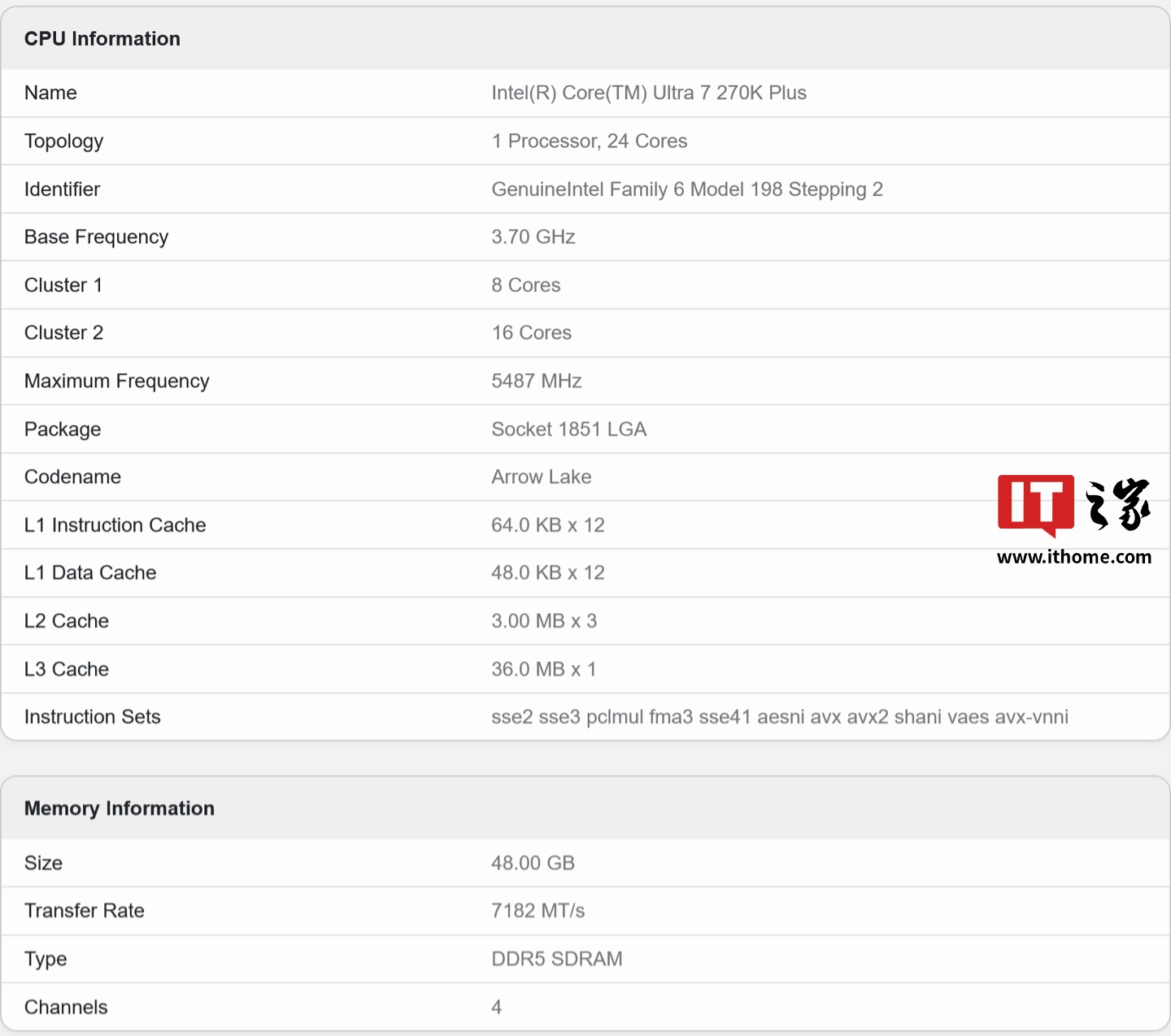 此外“酷睿 Ultra 7 270K Plus”在测试系统中配备 24GB×2 的 DDR5-7200 内存,可能暗示英特尔在刷新 "Arrow Lake" 时会提升原生内存频率支持。
