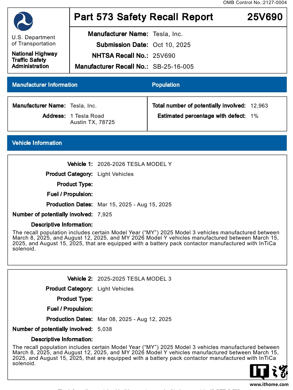 alixixi 10 月 22 日消息,由于“电池连接故障可能导致动力丧失”,特斯拉宣布在美国召回部分 2025 款 Model 3 和 2026 款 Model Y 车型,总计 12963 辆。
