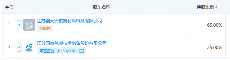 股权穿透显示,江苏创元合度新材料科技有限公司持股65%,江苏国富氢能技术装备股份有限公司持股35%。