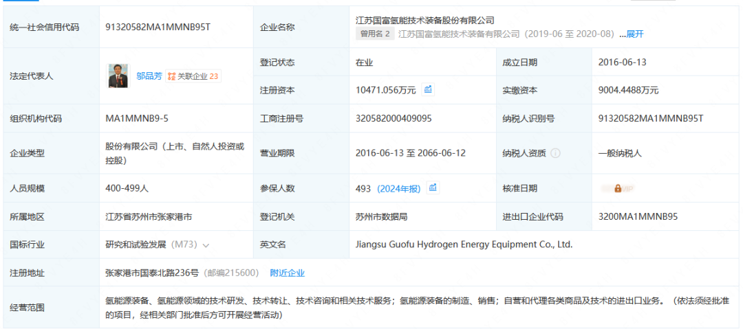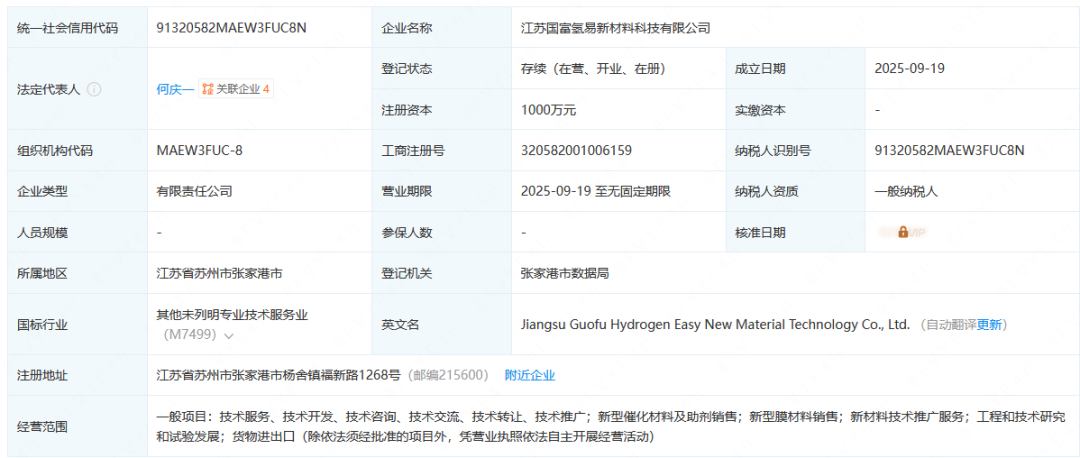 9月19日,国富氢能成立江苏国富氢易新材料科技有限公司。