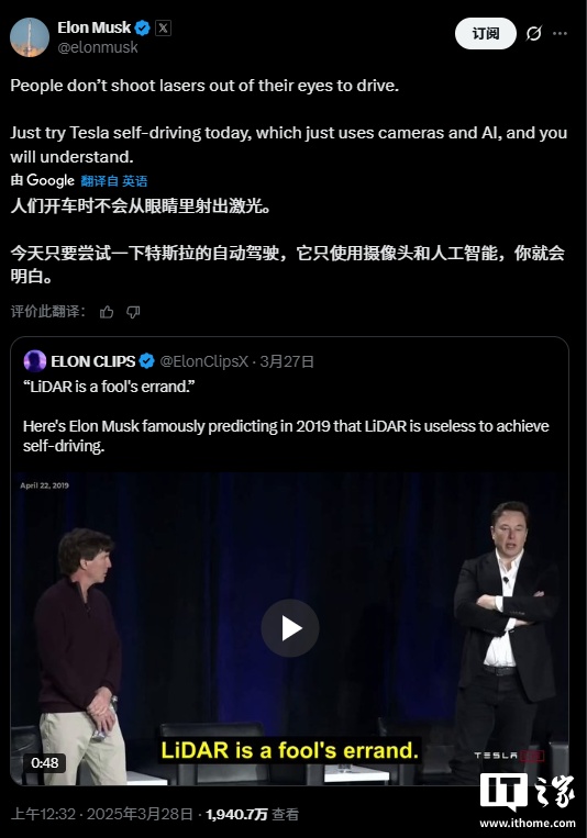 今年早些时候,马斯克再次重申了他对激光雷达根深蒂固的怀疑态度。“人们开车时并不会从眼睛里发射激光,”马斯克今年 3 月在 X 平台上发文写道,并附上了其 2019 年相关言论的视频链接,“不妨现在就试一试特斯拉的自动驾驶功能,它仅依靠摄像头和人工智能,你就会明白。”