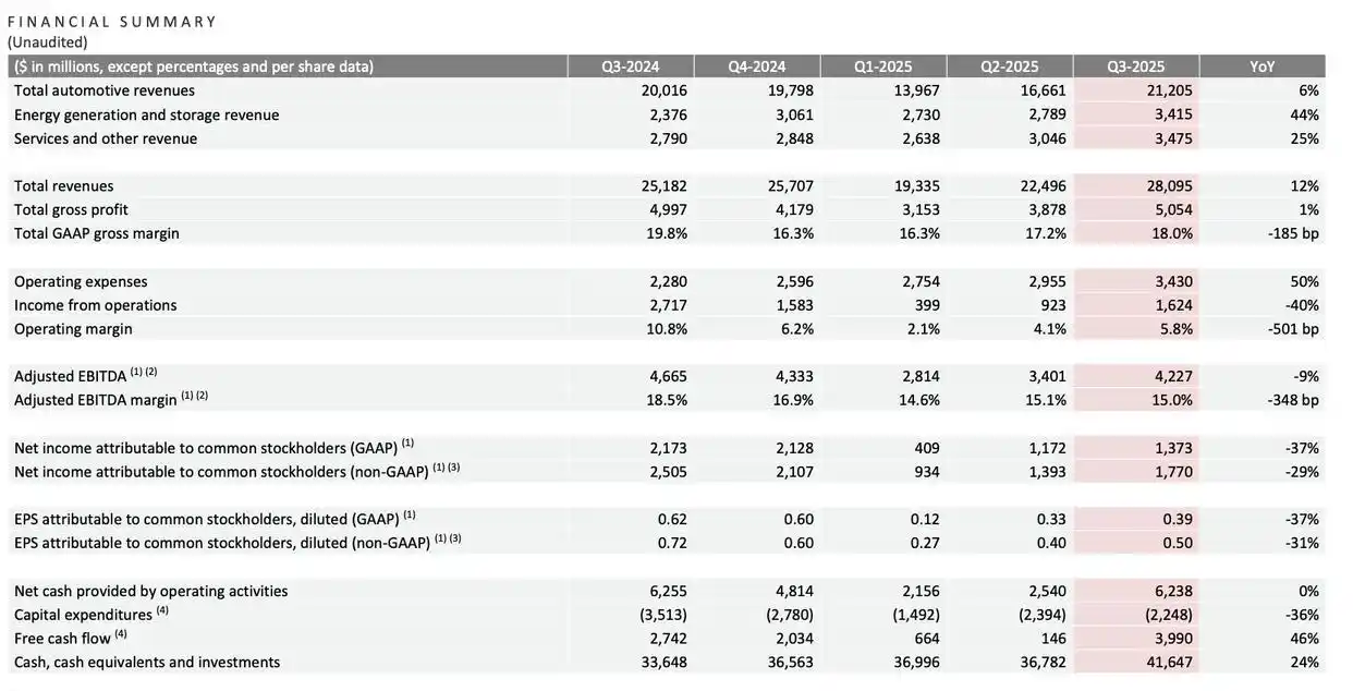 alixixi 10 月 23 日消息,周三美股盘后,特斯拉公布 2025 年第三季度财务业绩。