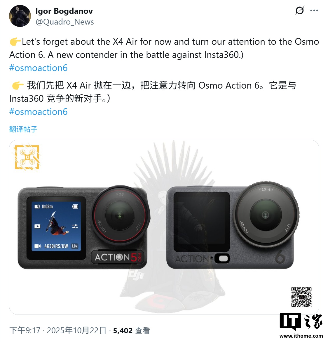 alixixi 10 月 23 日消息,消息源 Igor Bogdanov 昨日(10 月 22 日)在 X 平台发布推文,分享了一组高清渲染图,展示了大疆下一代运动相机 Osmo Action 6,基于目前泄露的信息,新品在传感器、视频录制和续航方面均有重大升级。