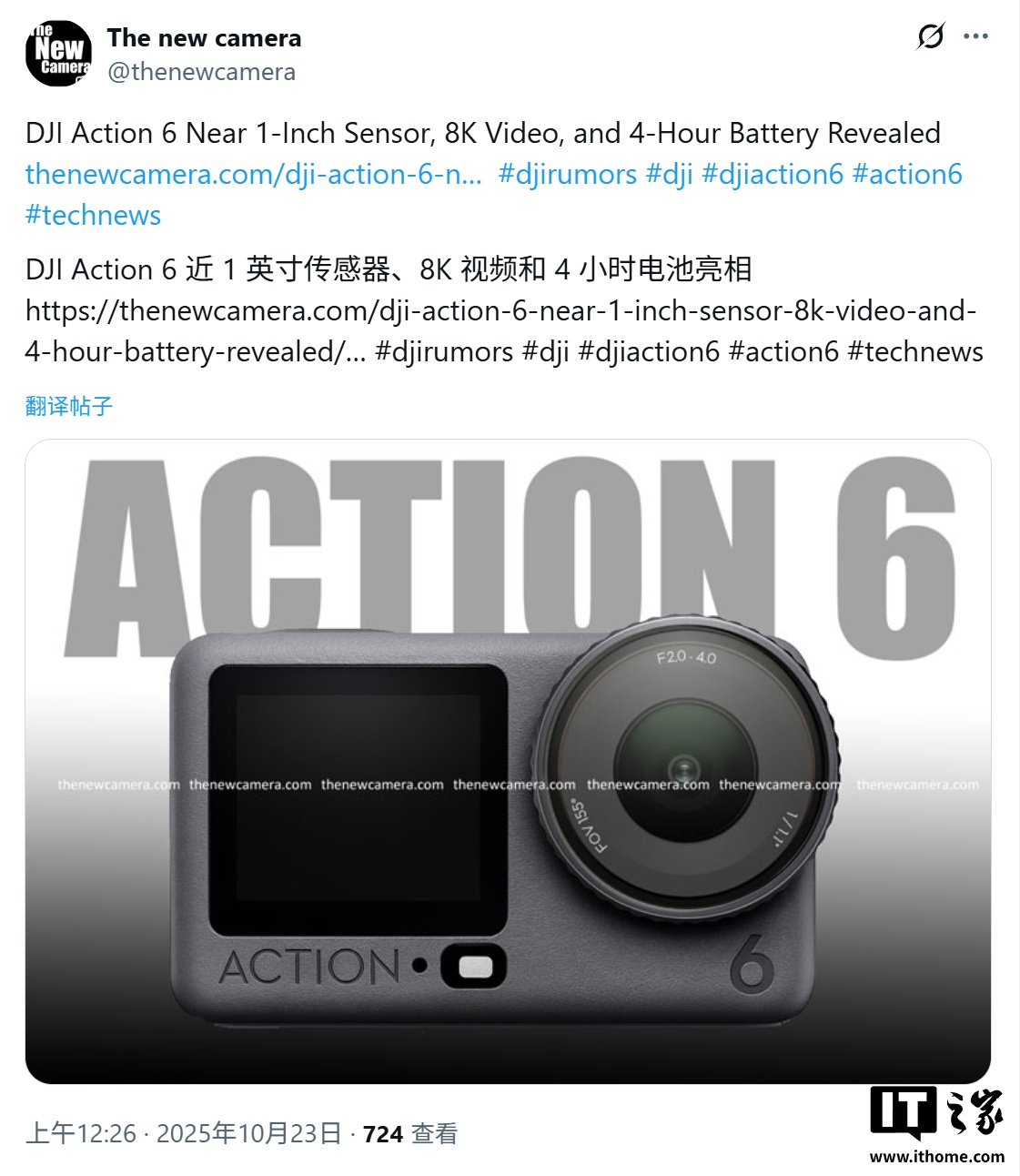 alixixi援引 thenewcamera 媒体介绍,大疆 Osmo Action 6 搭载了一块与索尼联合研发的 1/1.1 英寸堆栈式 CMOS 传感器,尺寸接近 1 英寸。