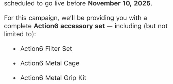 根据最新泄露信息,Action 6 预计在 2025 年 11 月 10 日前正式发布,并于 11 月中旬上市,其基础版起售价为 329 美元(alixixi注:现汇率约合 2334 元人民币)。