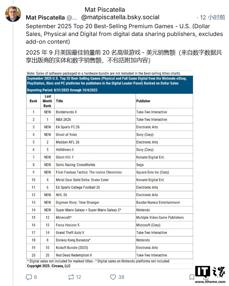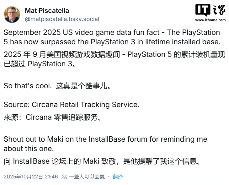 不过涨价似乎并不能浇灭消费者的热情,根据分析师 Matt Piscatella 昨天在社媒 BlueSky 的发文,索尼 PS5 在美国市场 9 月销量增长超 10%,部分原因可能是 3A 游戏阵容在上月表现强劲,尽管通胀压缩了玩家钱包,但多款 PS5 平台的新作还是刺激了主机销量。
