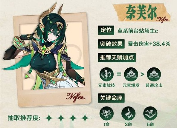 3、没有菈乌玛且没有草神的旅行者谨慎抽取:没有脱手后台草的情况下,只能靠奈芙尔自己产草露,会影响输出轴长和输出时间。