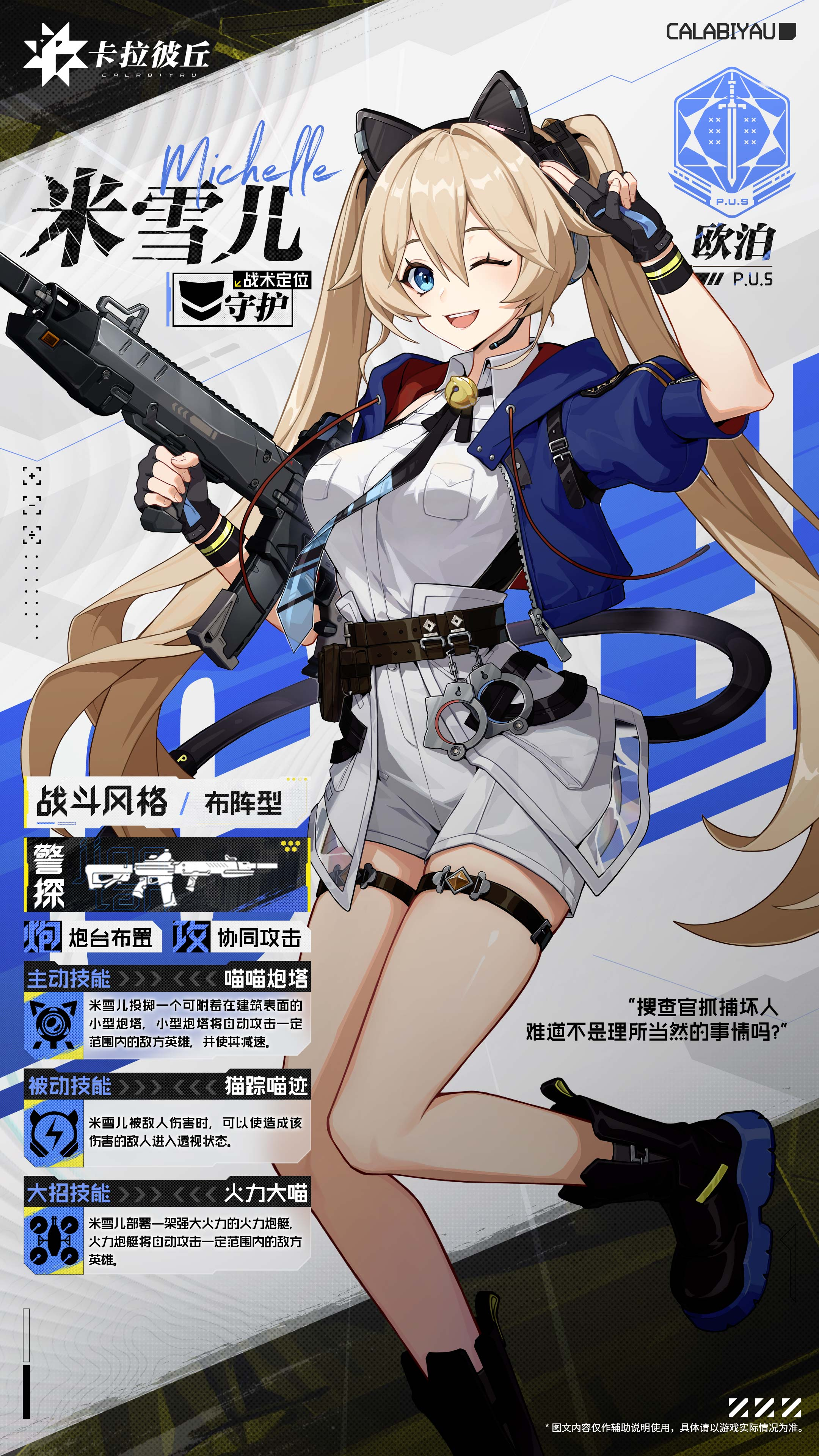 米雪儿是小编认为在首充中一定要选择的角色之一,她的主动技能喵喵卫士可以直接在自己所在的区域内部署上喵喵卫士,会对进入射程范围内的敌人自动开始射击,且附带有减速的效果,猫踪喵迹这个被动技能则能够让米雪儿拥有短暂的透视能力,不过要自己被敌人的枪械命中时才能触发哦,火力大喵这个终结技能可以直接部署火力炮艇,对范围内的敌人进行自动攻击。