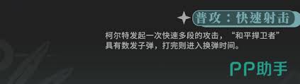 首先是普通攻击,辉烬柯尔特的普通攻击节奏流畅,攻速较快。连续的射击能迅速对敌人造成伤害,在近距离作战时可凭借高频输出压制敌人。