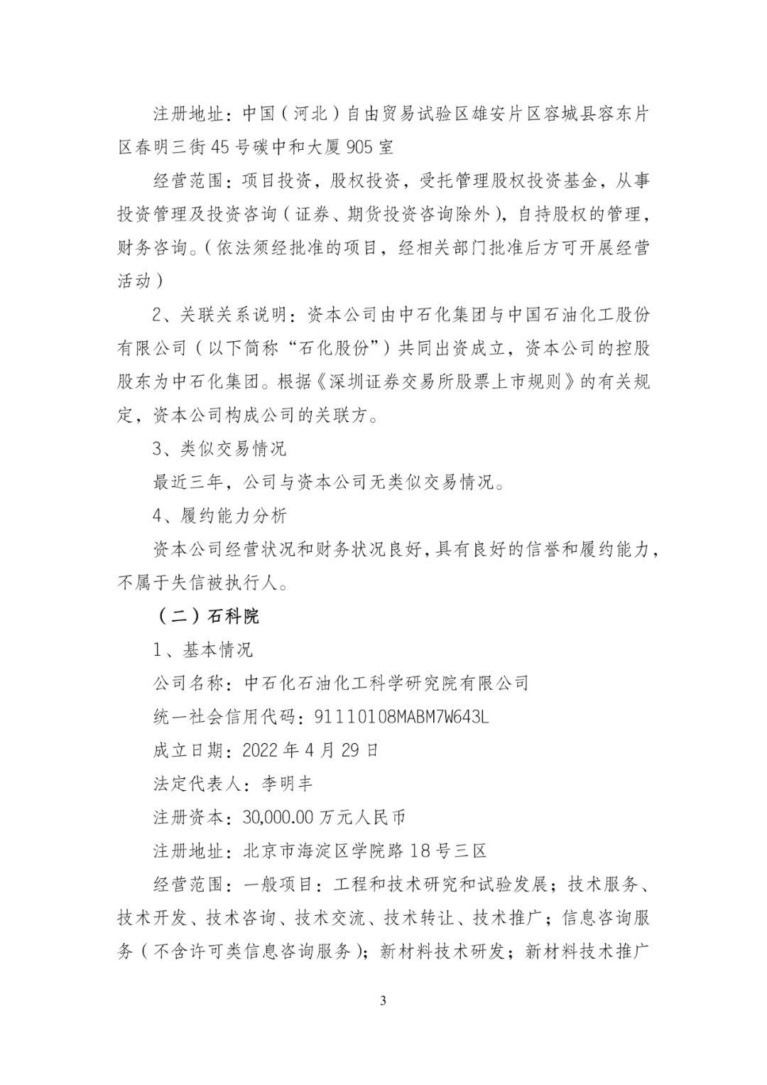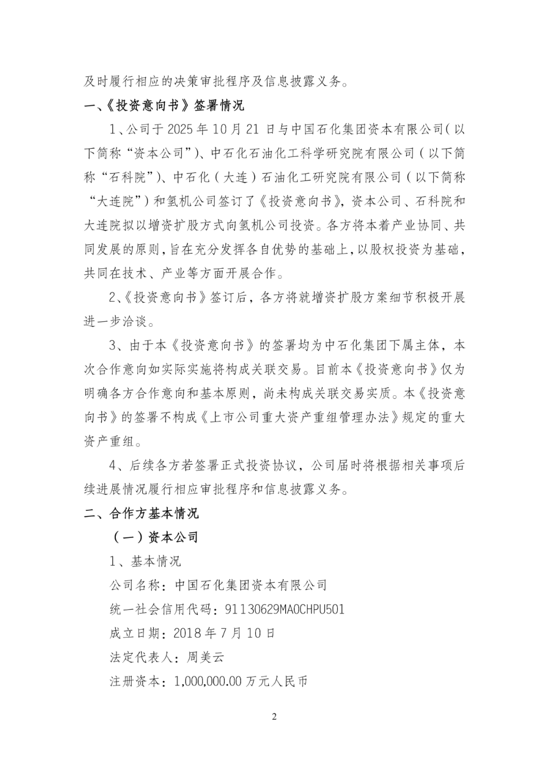 2、为推动科技成果转化,提升中国石化集团氢能产业链引领力,增强氢能机械公司核心竞争力,各方经充分协商,拟对中石化氢能机械(武汉)有限公司进行增资扩股,引入资本公司、石科院、大连院成为氢机公司新股东。资本公司拟以现金出资;石科院和大连院拟以氢能技术出资,具体出资技术经各方协商并经批准后确定。