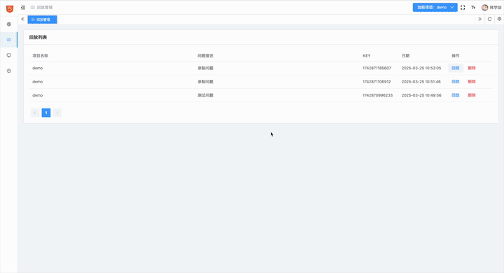 录制成功后,后台管理系统中便能查询到该条录制信息,点击回放,可以看到该问题的操作过程,以及浏览器信息、接口信息、日志信息等数据,如下图所示: