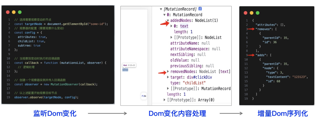 回放过程:读取记录的 JSON 数据,解析出页面的初始快照以及各个操作事件的时间序列,根据初始快照重建页面的 DOM 树,然后按照事件的时间顺序逐步应用每个操作事件。