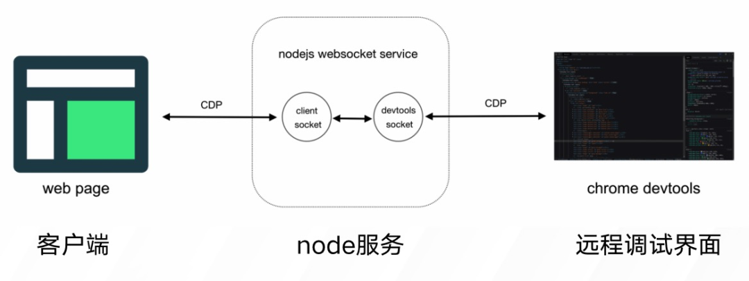 远程调试工具主要包括三个部分:客户端,中转服务,远程调试端(devtools)。