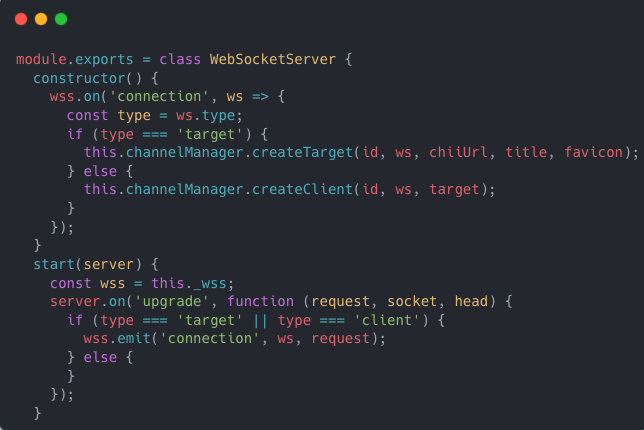 第一步:启动一个node服务作为中转服务器,然后创建webSocket服务用来连接客户端和远程调试端。