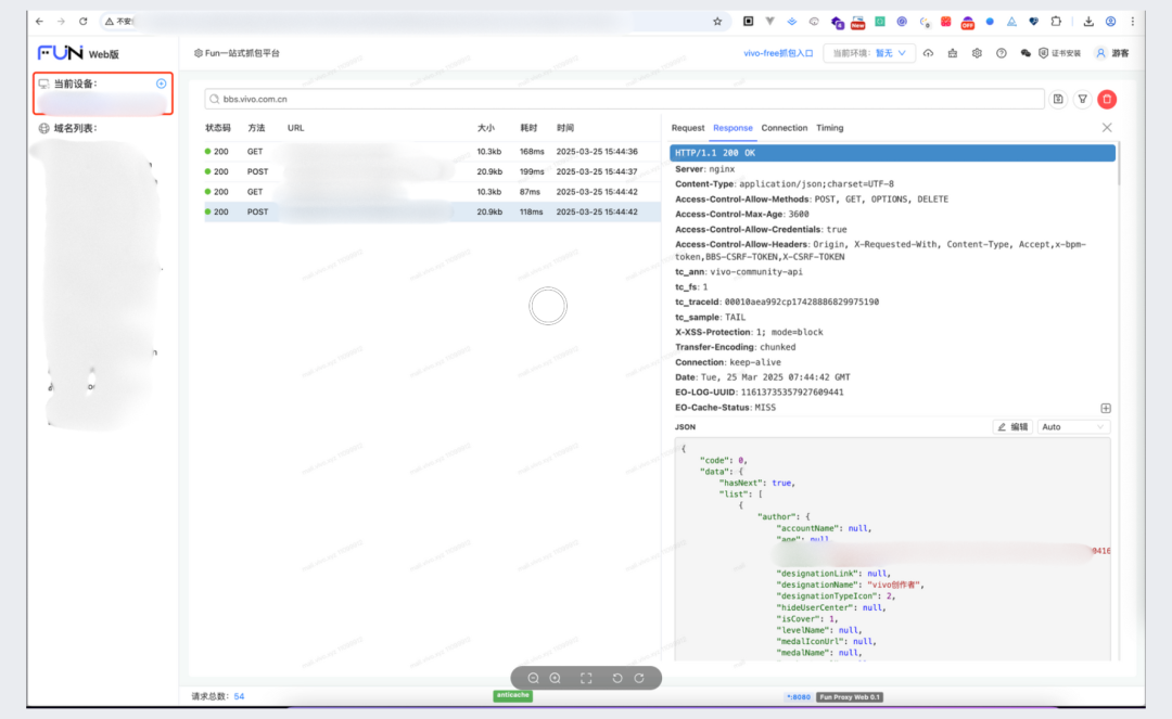 代理成功后,自动跳转到抓包页面,页面中会显示当前设备,也支持新增设备,可以同时对多个设备进行抓包、代理。并且支持对报文的篡改及环境的代理。