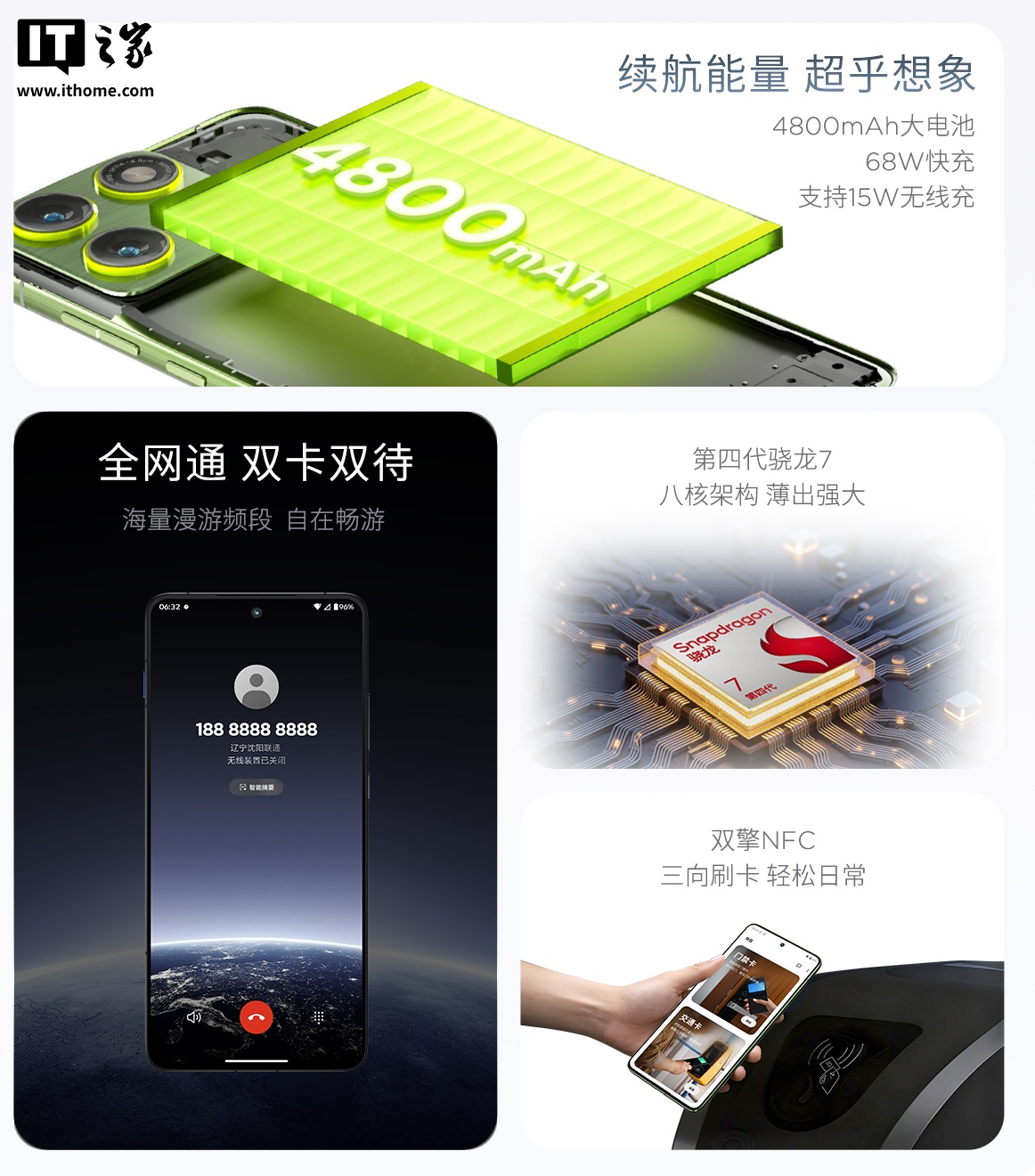 规格方面,该机搭载第四代高通骁龙 7 处理器,提供 12GB RAM,匹配 256/512GB 存储空间,内置 4800mAh 电池,搭配 68W 有线快充 + 15W 无线充电,同时机身内置 NFC,支持三向刷卡。
