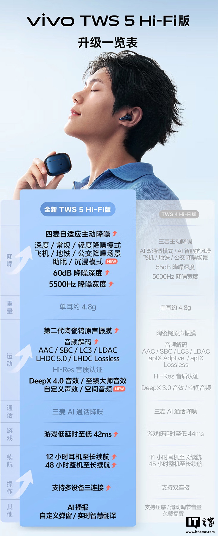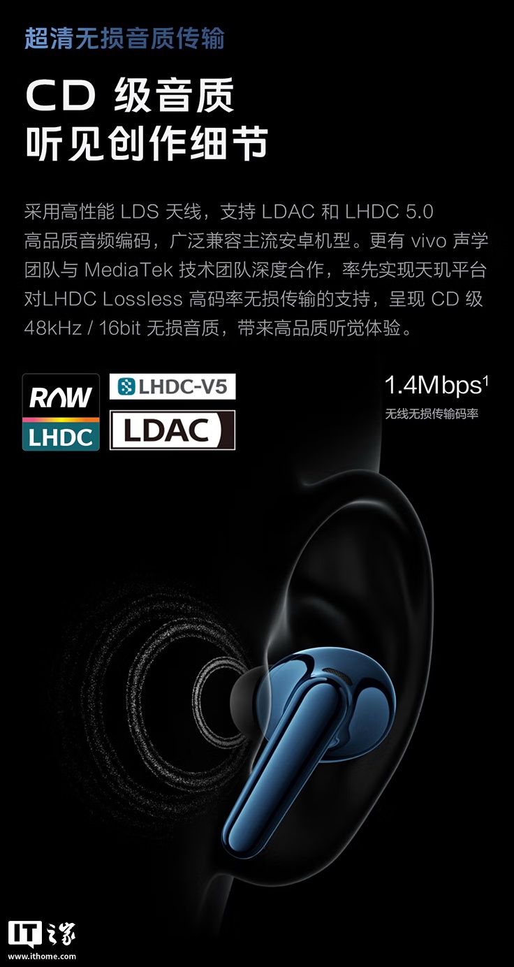 新品支持跨生态无缝三连接,安卓苹果全能连;vivo 金耳朵声乐团队与上海音乐学院联合调音,获得 Hi-Res 高品质无线音频认证;同步支持实时智慧翻译,个性化智慧弹窗,48 小时长续航,42ms 超低游戏延迟等全新功能。