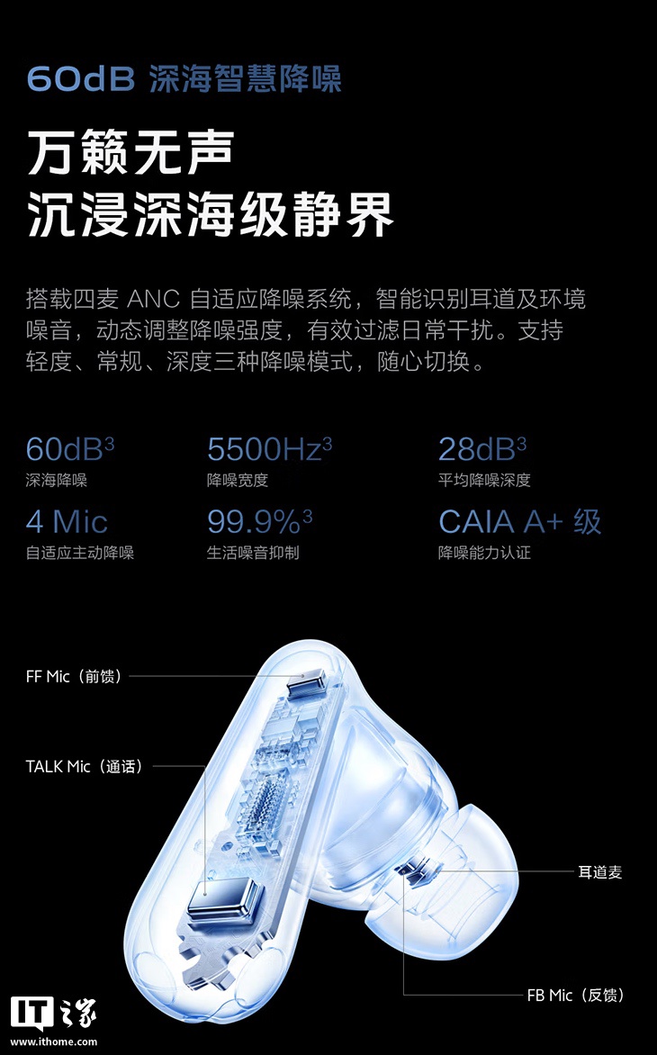 alixixi从官方介绍获悉,这款耳机采用入耳式设计,支持“四麦克风自适应主动降噪”,最大降噪可达 60dB,提供 5500Hz 降噪宽度,同时支持 LDAC、LHDC-V5 等传输协议。