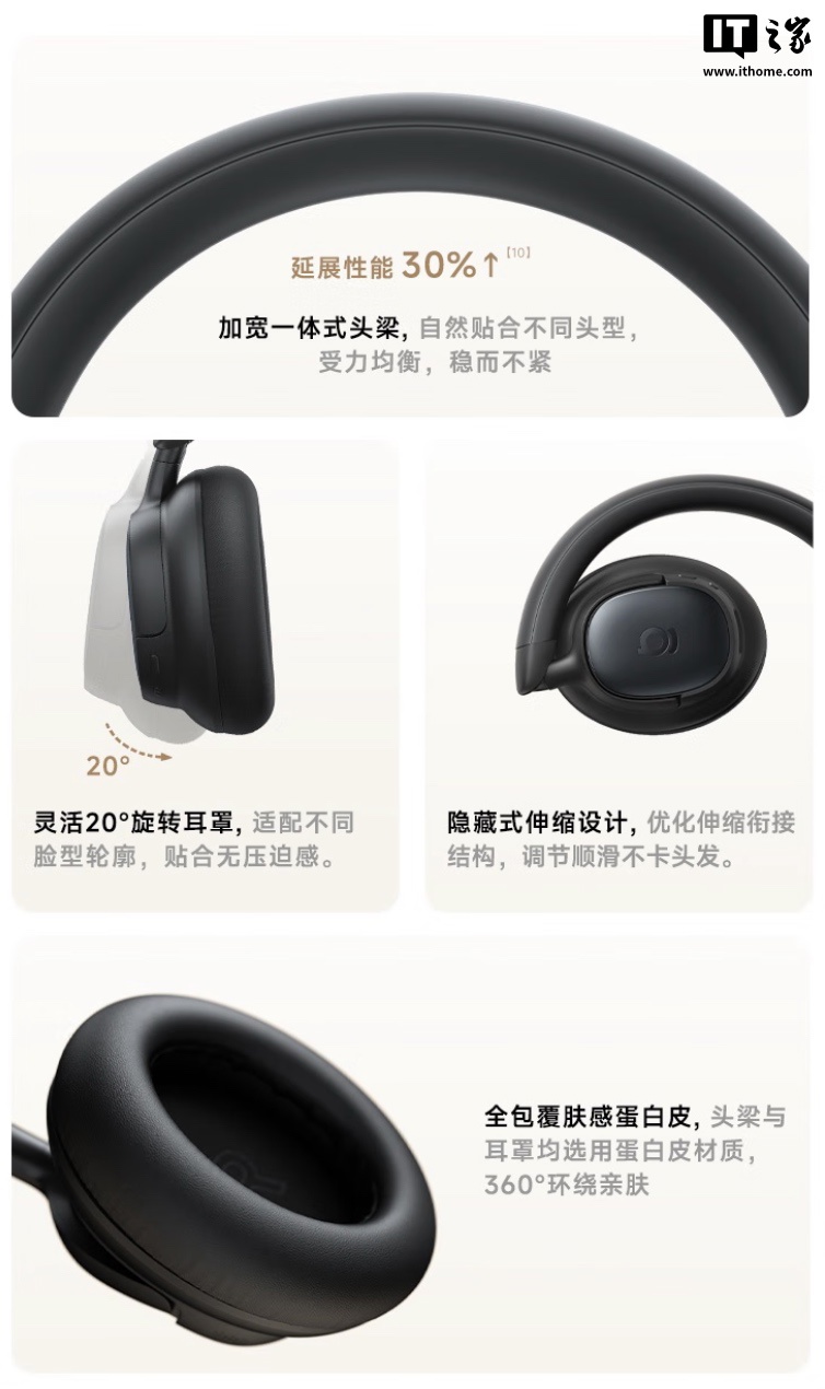 该耳机可选灰黑双色,整体重量约 245g,匹配加宽一体式头梁、蛋白皮耳罩,外壳采用 2.5D 喷砂质感,整体支持折叠收纳。