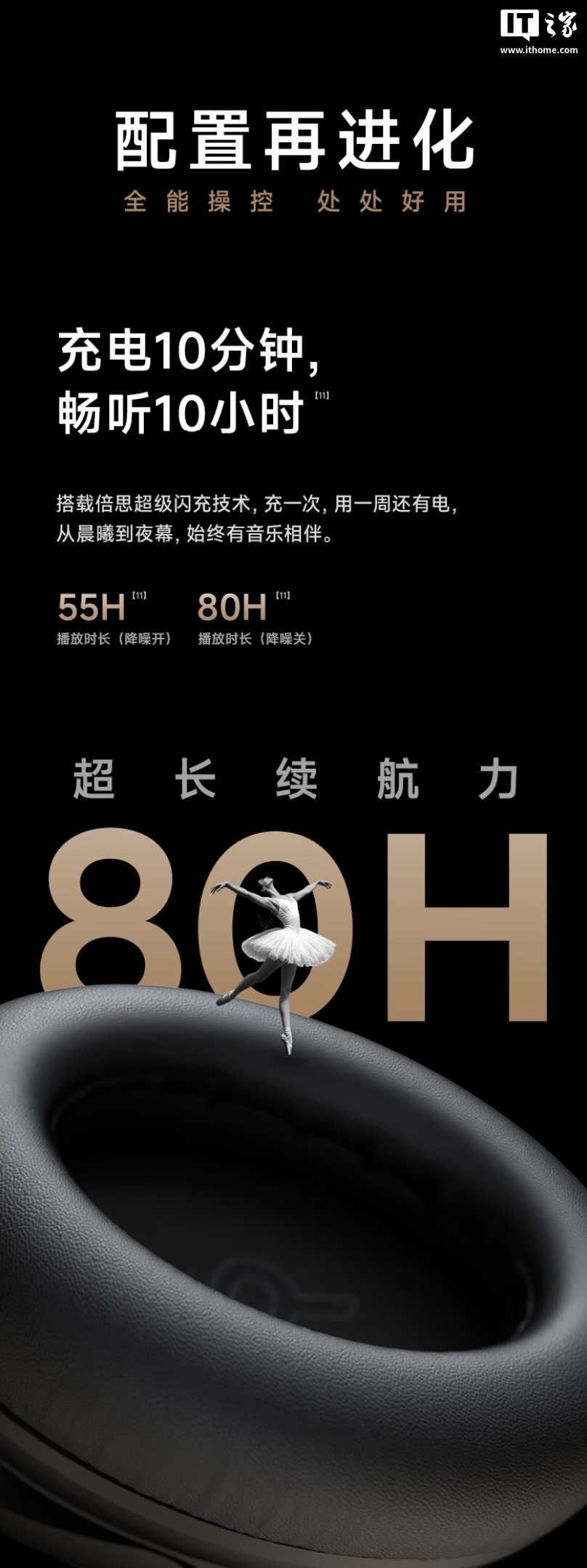 该耳机采用 LCP 液晶高分子振膜,搭载自适应降噪 3.0 技术,提供 -48dB 降噪深度,同时也支持通透模式、5 麦克风通话降噪。耳机支持 LDAC 传输、55ms 延迟,同时支持 AI 助理对话,耳机内置 660mAh 电池,续航至高 80 小时。