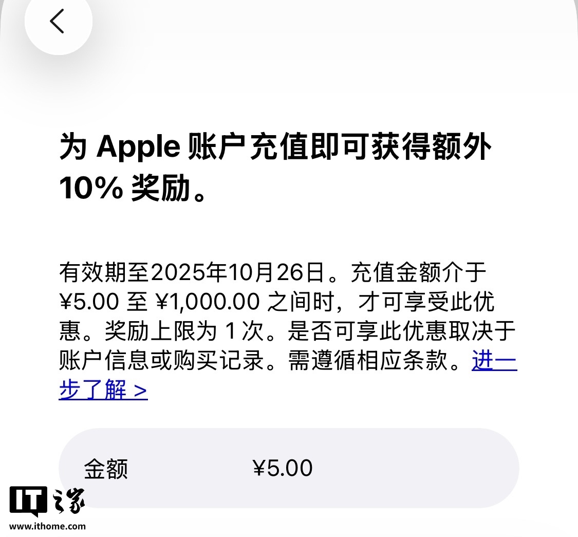 需要注意的是,每个 Apple 账户只可享受 1 次充值优惠,是否可享优惠取决于账户信息或购买记录,须遵循相应条款。