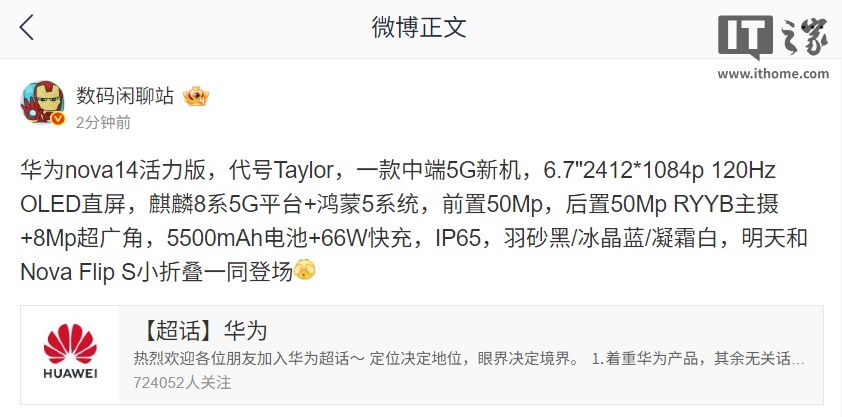 博主 @数码闲聊站 爆料,华为 nova 14 活力版代号 Taylor,是一款中端 5G 新机,搭载 6.7 英寸 2412*1084p 120Hz OLED 直屏,麒麟 8 系 5G 平台 + 鸿蒙 5 系统,前置 50Mp,后置 50Mp RYYB 主摄 + 8Mp 超广角,5500mAh 电池 + 66W 快充,IP65,羽砂黑 / 冰晶蓝 / 凝霜白。