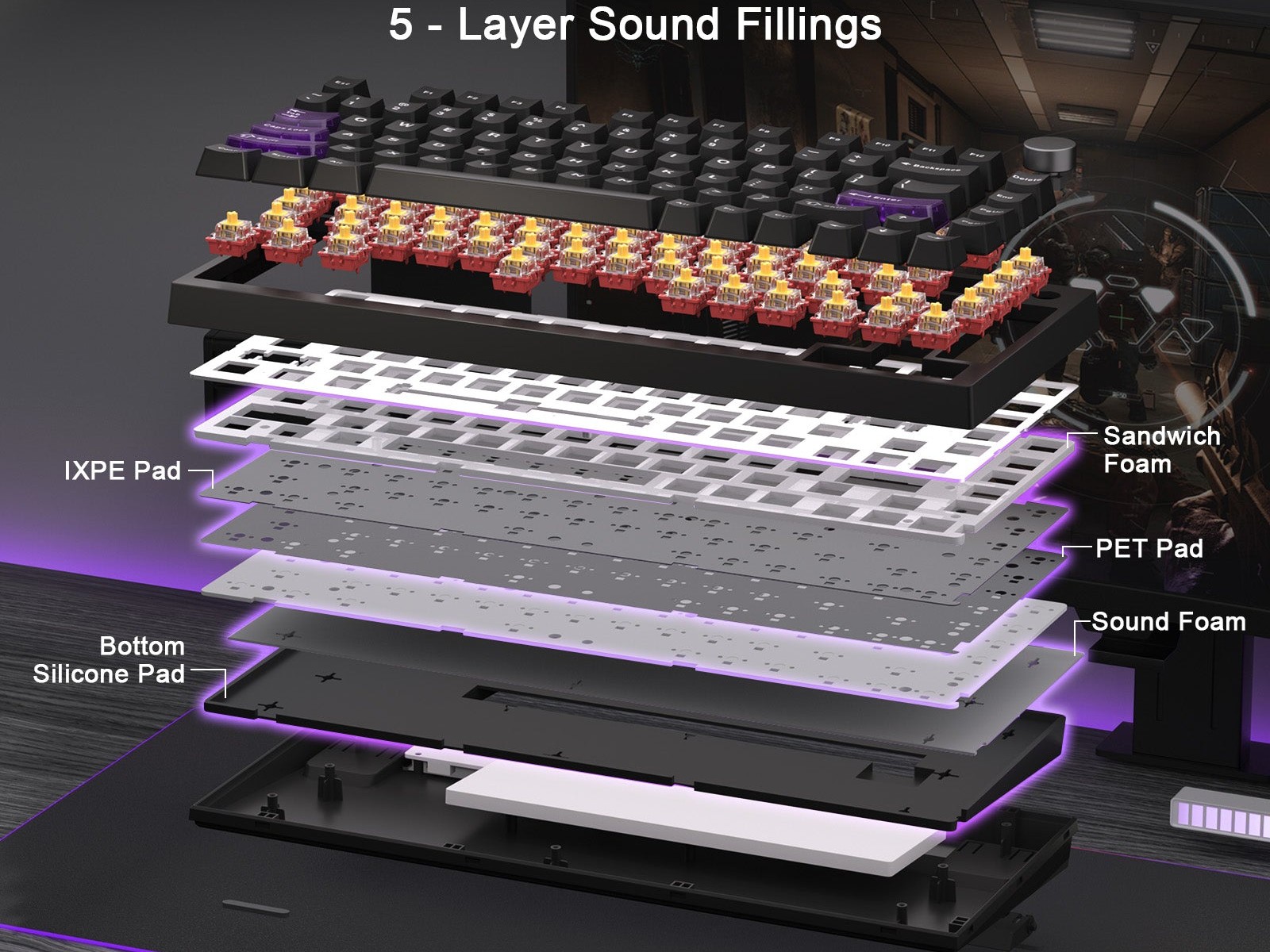 RT75 PRO 键盘外观上属于 81 键 + 1 旋钮的 75% 配列,内部为 TOP 固定设计,包含铝制定位板、5 层吸声填充结构、南向 RGB 背光,底部提供两段式脚撑。