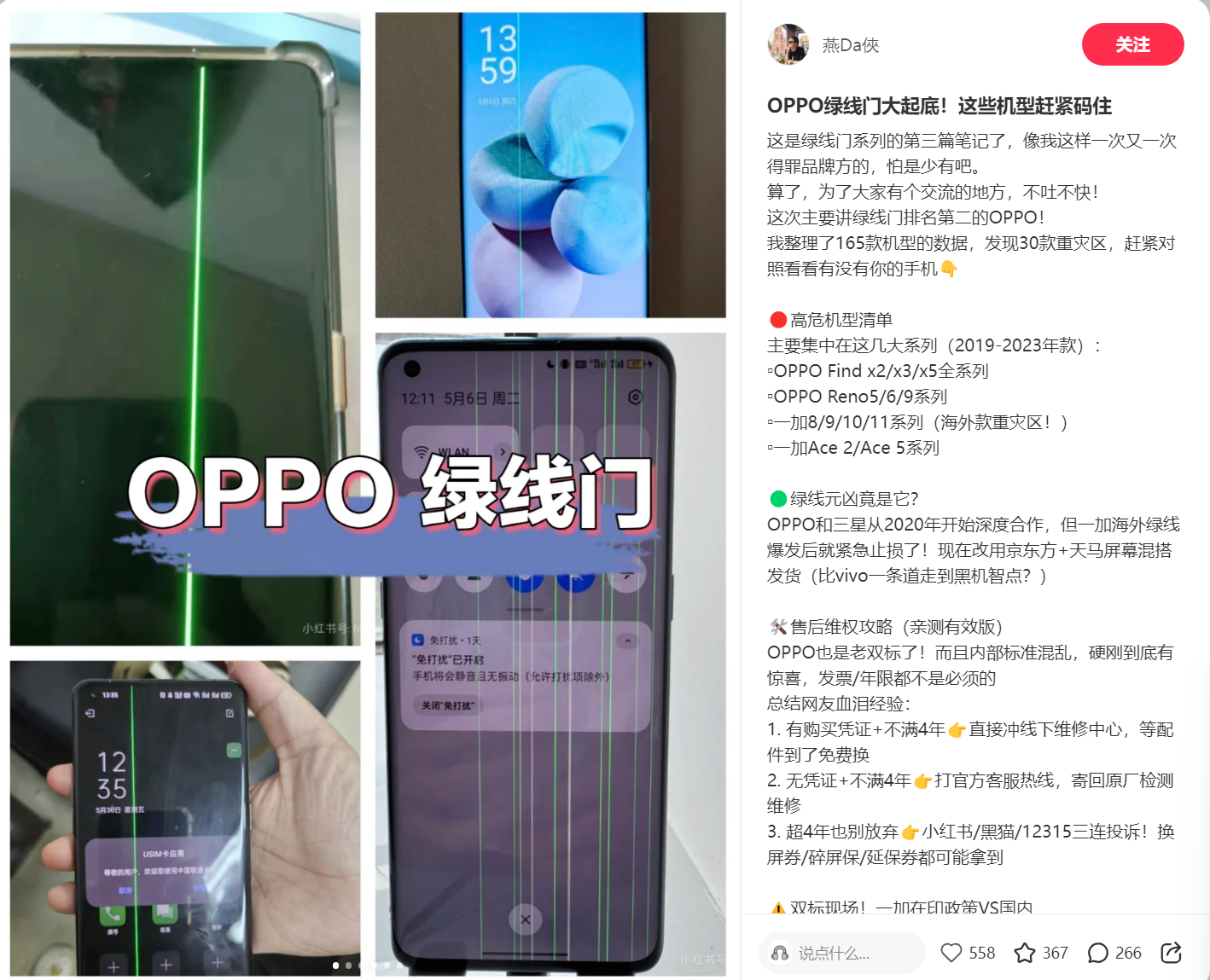 报道还援引小红书博主 @燕Da侠 所整理的内容称,绿线投诉较多的机型,大多采用的是三星提供的屏幕。