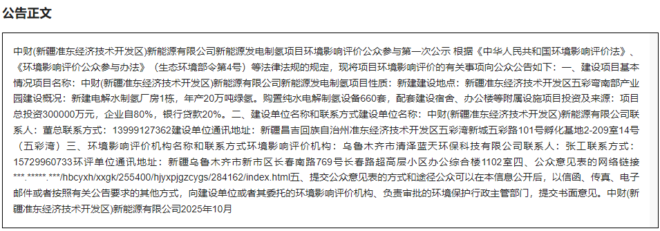 10月20日,华汇城市建设服务平台发布中财(新疆准东经济技术开发区)新能源有限公司新能源发电制氢项目环境影响评价公众参与第一次公示。