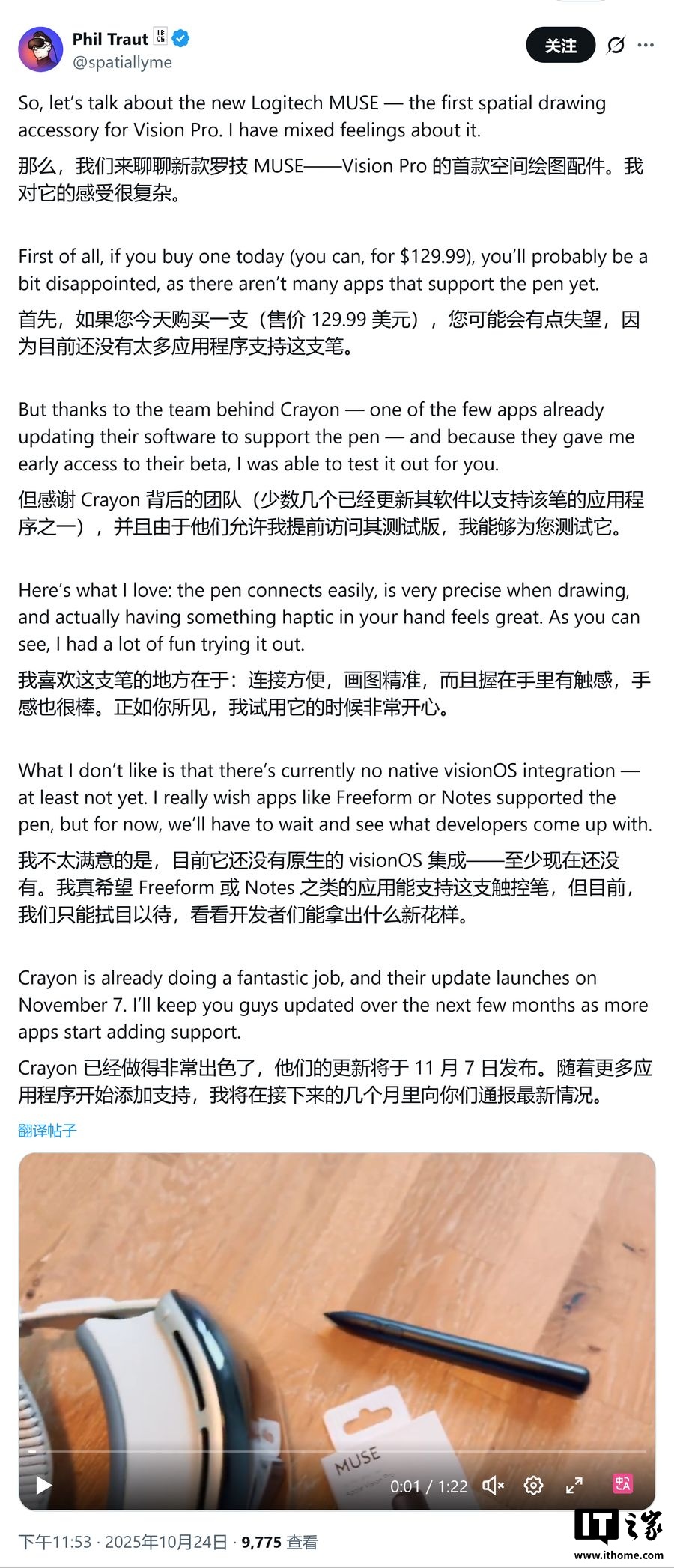 alixixi 10 月 25 日消息,科技媒体 9to5Mac 昨日(10 月 24 日)发布博文,罗技(Logitech)推出首款专为 Apple Vision Pro 设计的空间手写笔 Muse,但目前并不兼容苹果自家的无边记(Freeform)和备忘录(Notes)等应用,尚未获得 visionOS 的原生系统集成。