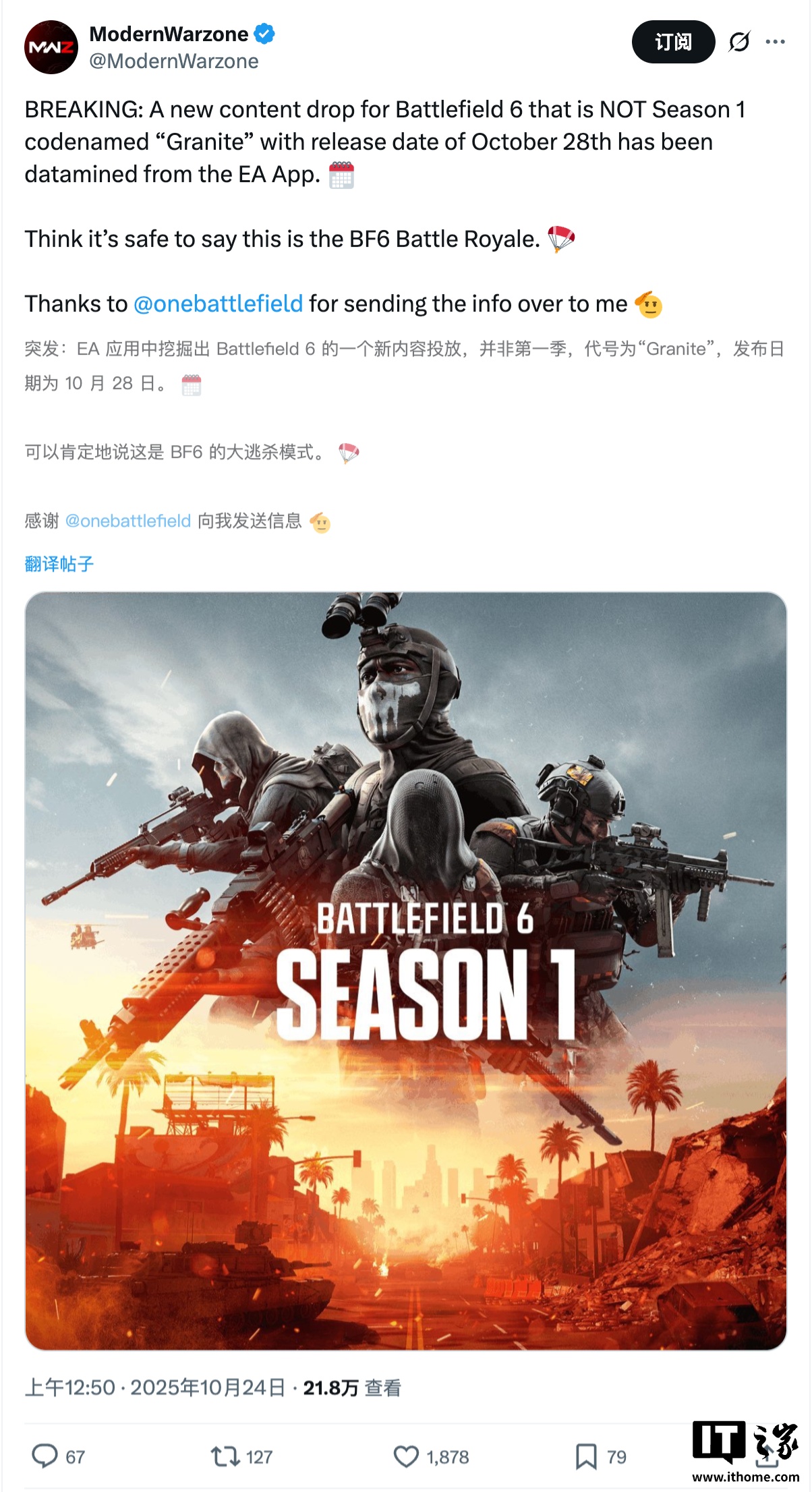 这部分新内容代号为 Granite,计划于 10 月 28 日发布,与第一季的开始时间一致。该账号表示:“这应该就是《战地》的大逃杀模式。”