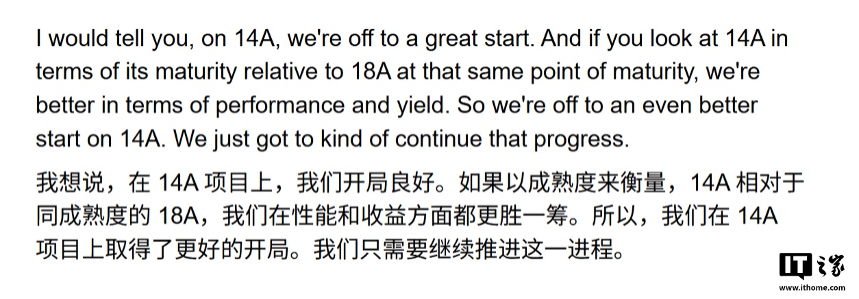 alixixi 10 月 25 日消息,科技媒体 Wccftech 昨日(10 月 24 日)发布博文,报道称英特尔首席财务官大卫・津斯纳(David Zinsner)透露,其面向外部晶圆代工客户的 14A 工艺节点取得重大进展,在同等开发成熟度下的性能和良率均已超越前代 18A 节点。