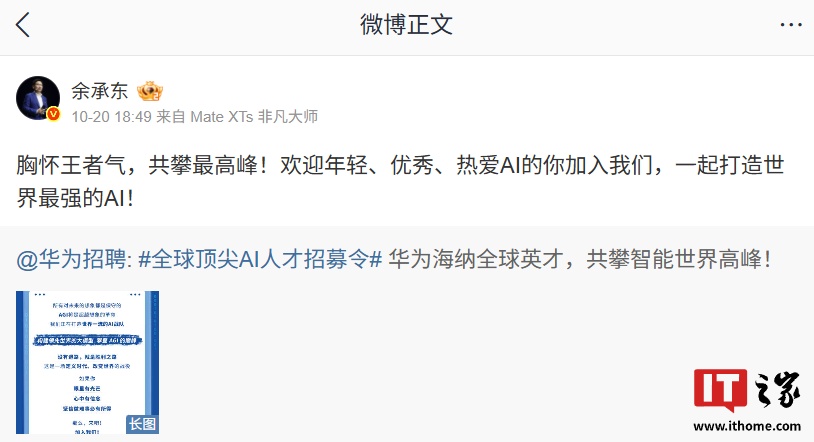 值得一提的是,华为招聘官微 10 月 20 日发布“全球顶尖 AI 人才招募令”,目标明确为打造世界一流的 AI 战队,构建领先世界的大模型,攀登 AGI 的巅峰。稍晚时候,华为常务董事、终端 BG 董事长余承东也转发了该信息,这也是余承东兼任华为 IRB 主任之后的首条相关微博。