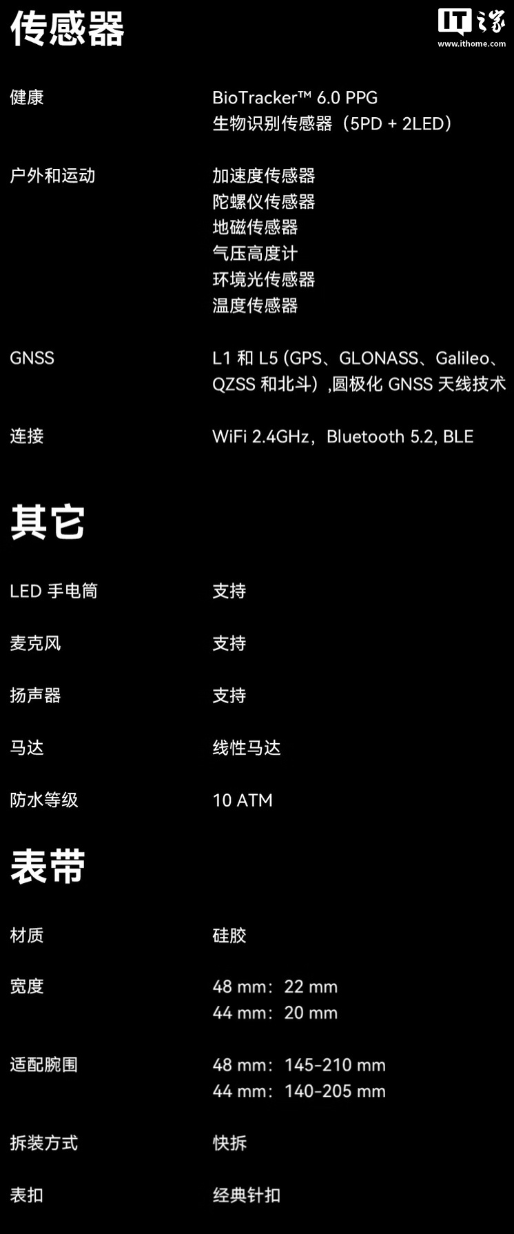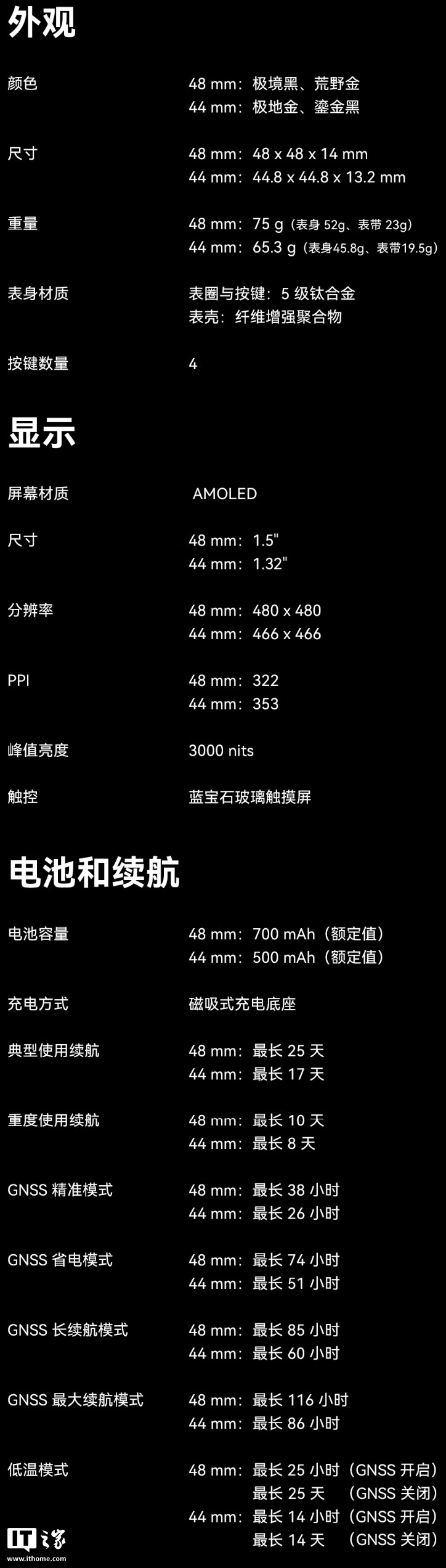 其他方面,该表提供地形图导航功能,内置 180 多种运动模式,搭载 Zepp OS 5.0,支持 10ATM 防水,配有独立扬声器,匹配 500 毫安时电池,日常使用续航 17 天;GNSS 精准模式下,持续工作时长 26 小时;GNSS 最大续航模式下可使用至多 86 小时。
