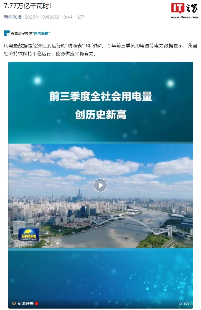 alixixi 10 月 26 日消息,据新闻联播报道,我国今年前三季度全社会用电量达 7.77 万亿千瓦时,创历史新高。其中,一、二、三季度全社会用电量同比分别增长 2.5%、4.9% 和 6.1%。前三季度,水电、风电、太阳能发电等清洁能源发电占比达到 35.3%,比上年同期提高 1.9 个百分点。
