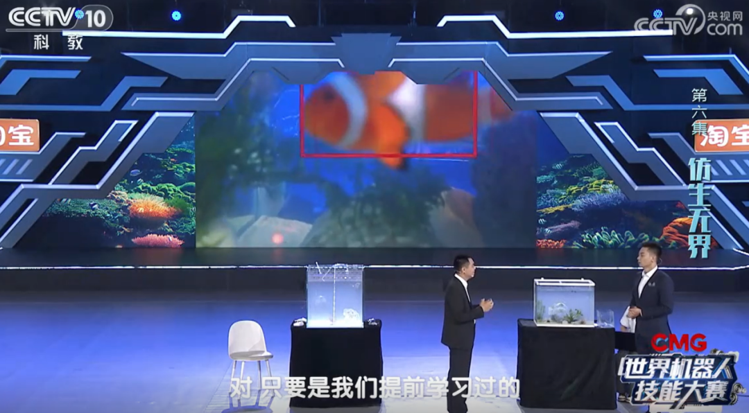 陶凯教授现场演示了该机器人的智能化应用,通过集成微型摄像头模组和嵌入式 AI 处理芯片,仿生水母机器人成功在动态水环境中实现稳定悬停,并精准识别出水下的特定目标(如校徽、小丑鱼)。这一功能有力验证了在仿生平台上实现自主环境感知与目标识别的可行性。