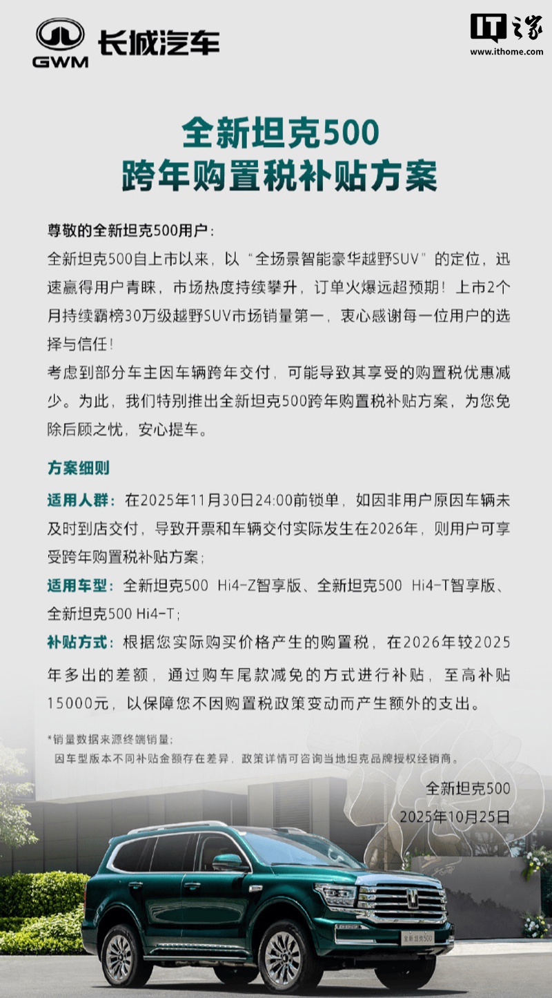 alixixi 10 月 26 日消息,长城汽车宣布为 2026 款坦克 500 车型推出“跨年购置税补贴方案”,适用新款坦克 500 Hi4-Z 智享版、新款坦克 500 Hi4-T 智享版、新款坦克 500 Hi4-T 车型。