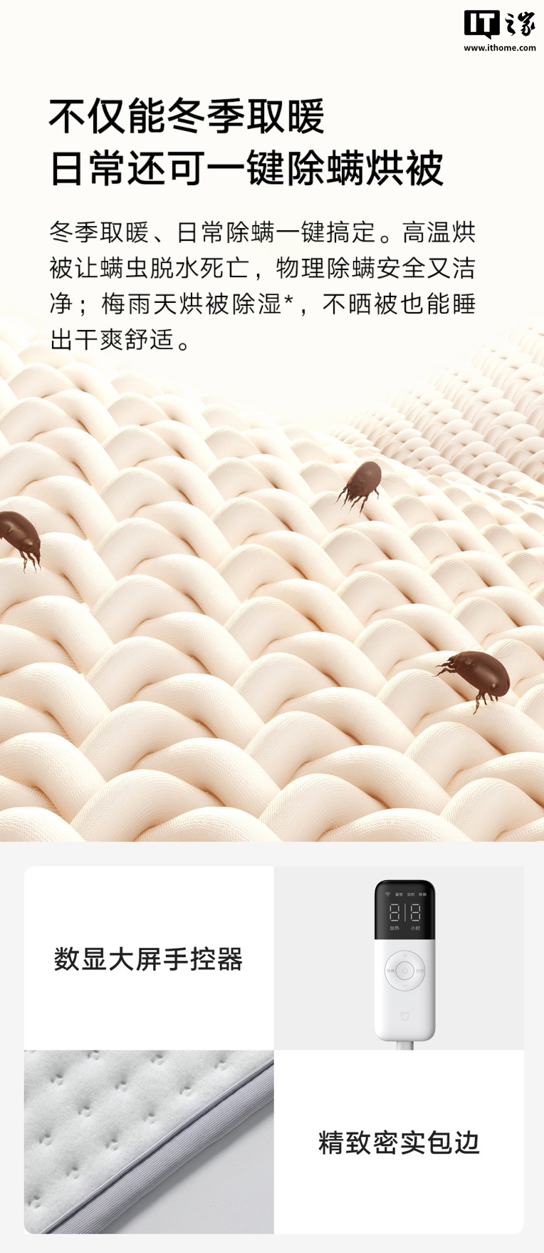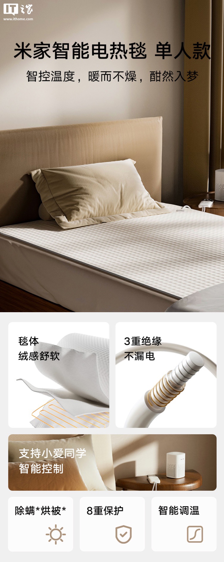 其他方面,该电热毯支持小爱同学语音控制,可通过米家 App 远程预约定时开关及设置分时温度,同时还提供除螨模式。
