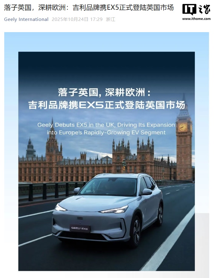 alixixi 10 月 26 日消息,10 月 23 日,吉利汽车在伦敦举办品牌发布盛典,正式进入英国市场,首发车型为纯电 SUV—— 吉利国际 EX5。