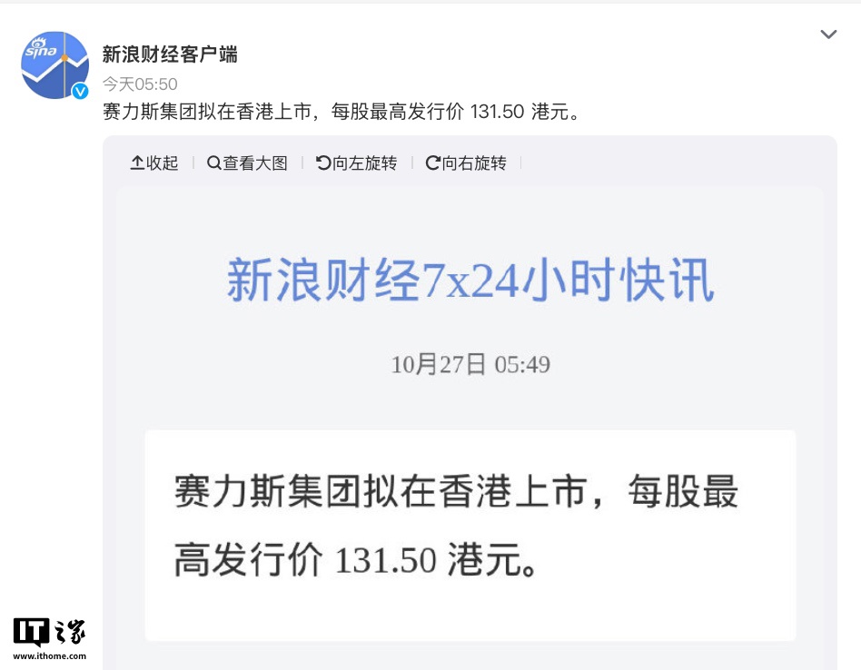 alixixi 10 月 27 日消息,据新浪财经,赛力斯集团拟在香港上市,每股最高发行价 131.50 港元,预计 11 月 5 日在香港开始交易。