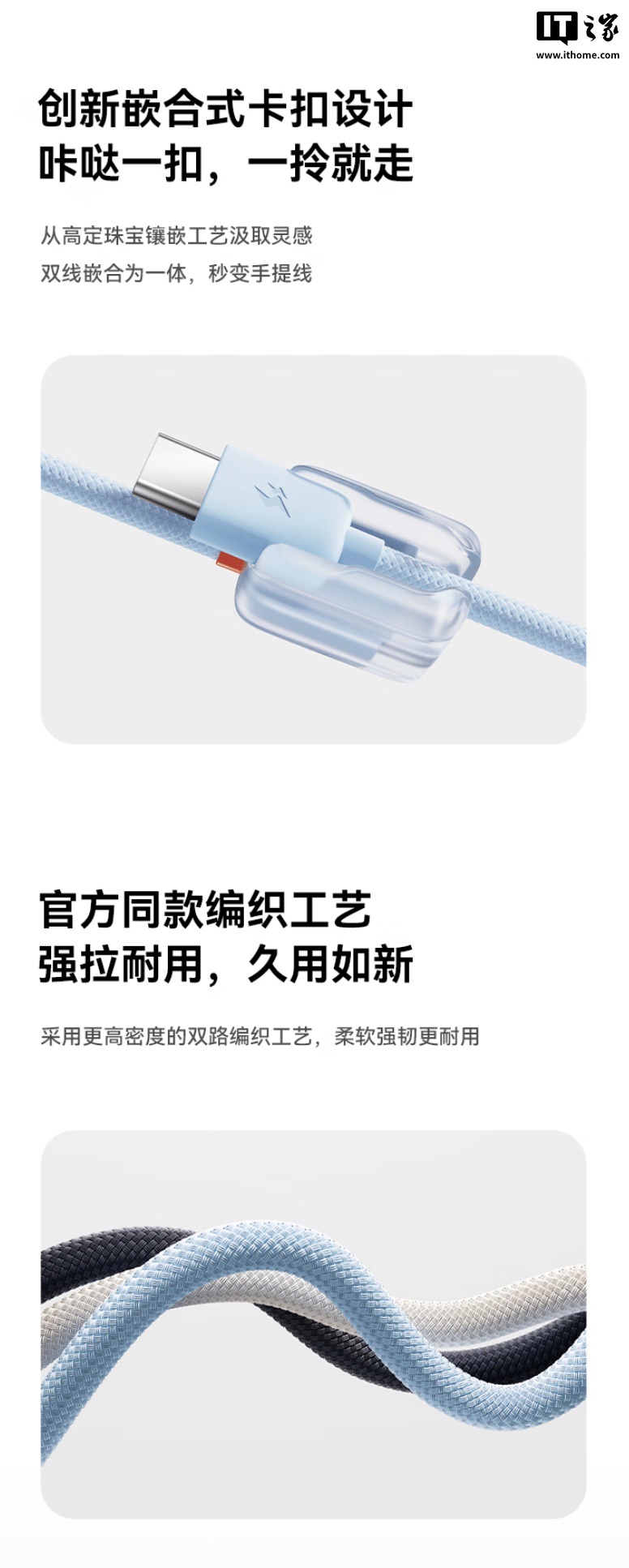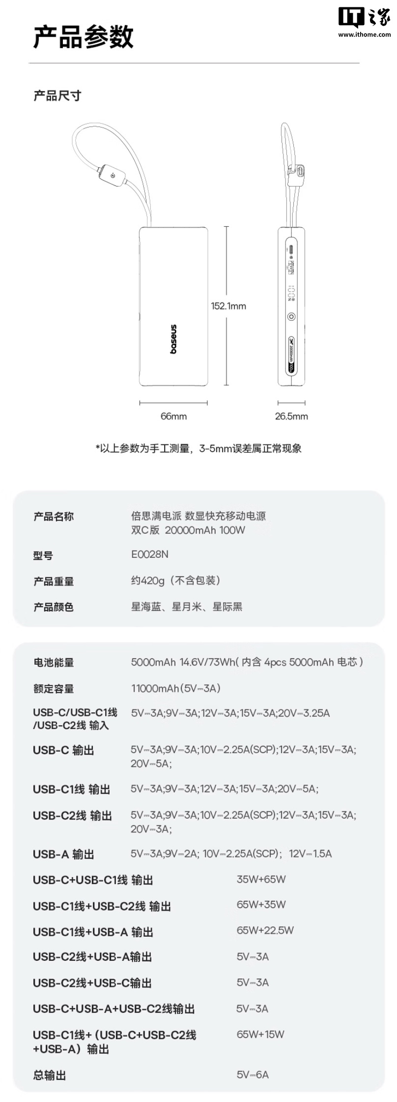 该机目前在售蓝 / 黑配色,外观采用亲肤材质,匹配的 USB-C 充电线可组合形成移动电源手提带。移动电源兼容 PD / PPS / UFCS / SCP 等协议,支持小米 55W 快充,苹果 iPhone 45W 充电,其中 USB-C 接口至高支持 100W 输出、USB-C1 充电线支持 100W 输出、USB-C2 充电线支持 50W 输出、USB-A 接口支持 22.5W 输出。