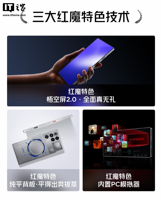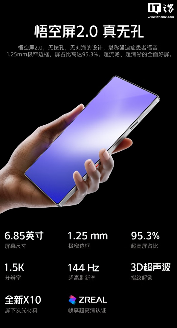屏幕方面,这款手机搭载悟空屏 2.0,屏占比达 95.3%,边框窄至 1.25mm,采用 1.5K 144Hz 高刷设计,配备 3D 超声波指纹解锁,配备红魔一脉相承的屏下摄像头,没有传统全面屏手机的挖孔、刘海,看起来更加美观。