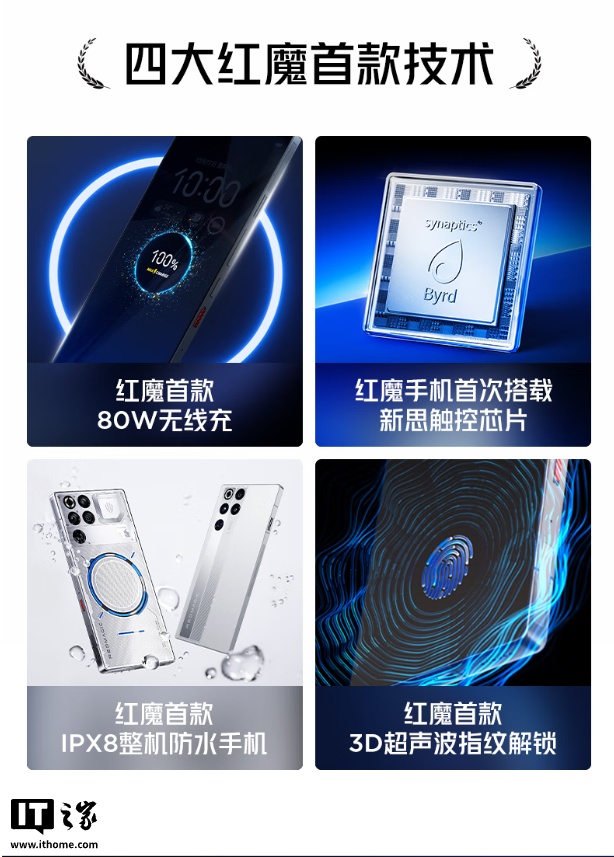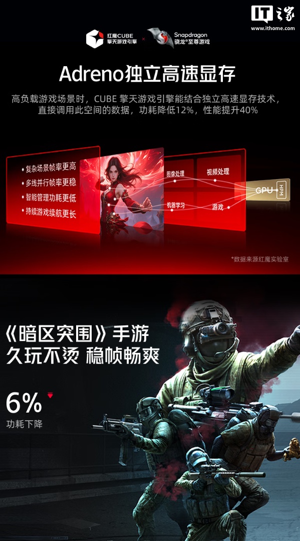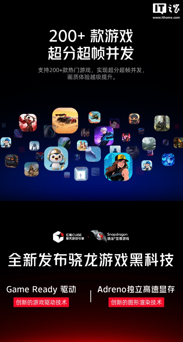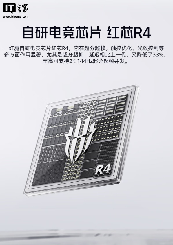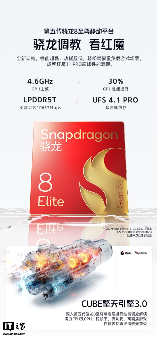 硬件方面,红魔 11 Pro + 手机搭载第五代骁龙 8 至尊版芯片,CPU 主频可达 4.6GHz,GPU 性能提升 30%,搭配 LPDDR5T 内存(alixixi注:最高频率可达 10667Mbps)和 UFS 4.1 Pro 闪存,拥有自研电竞芯片红芯 R4,至高支持 2K 144Hz 超分超帧并发,适配 200 + 热门游戏。