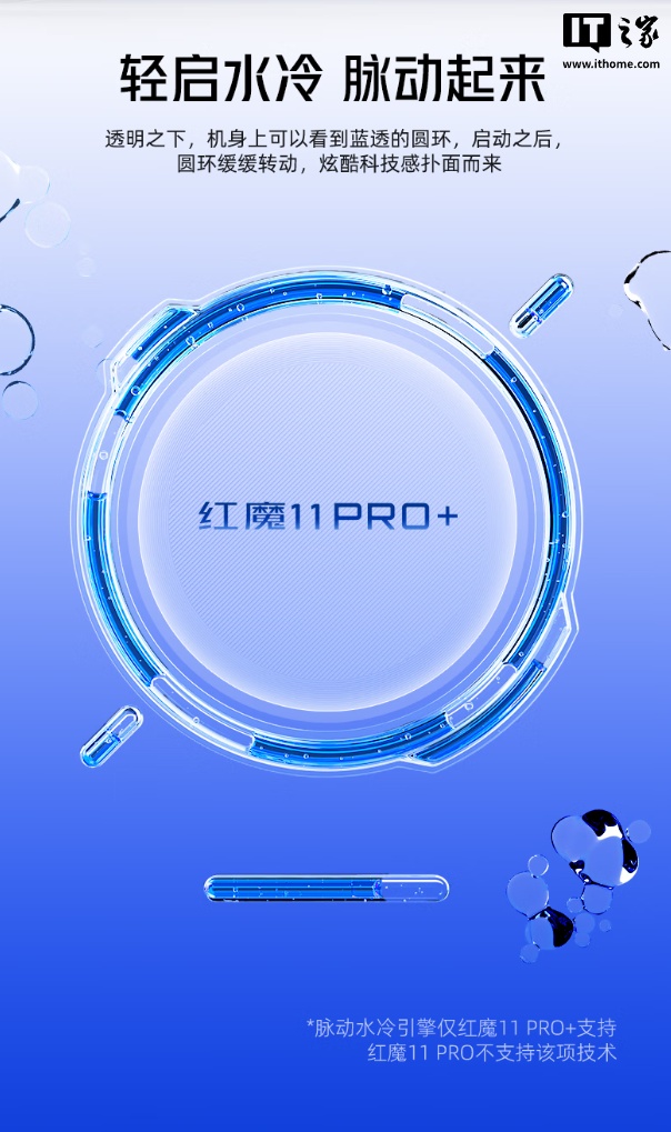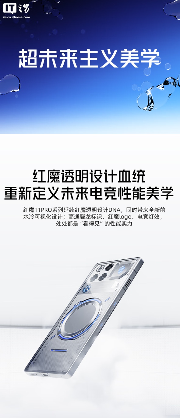 外观方面,红魔 11 Pro + 手机延续了透明设计 DNA,背板拥有高通骁龙 Logo、红魔 Logo 和电竞灯效,水冷结构采用透明可视化设计,启动之后圆环会缓缓转动,带来“炫酷科技感”,手机整体采用纯平设计,放在桌面上是平整一块,不会有“跷跷板”现象。