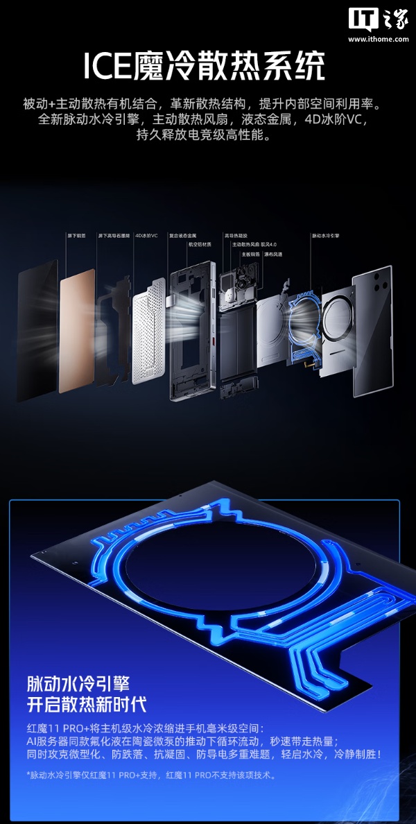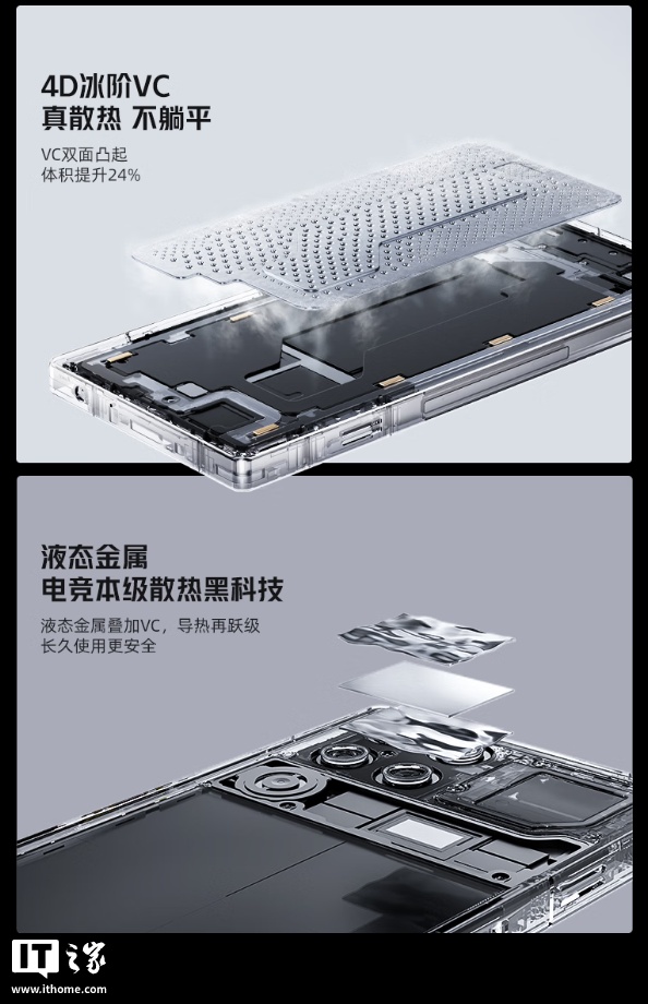 这款手机是行业首款风水双冷手机,内部配备 AI 服务器同款散热液,液态范围-60℃~108°C,无需担心低温环境,行业首创超低温键合工艺、独家高分子缓冲材料,采用独家微型陶瓷泵,功耗低至 80mW,输出压力达 100kPa。
