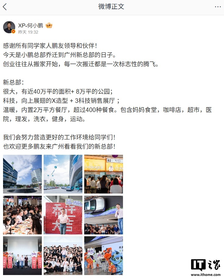 小鹏汽车 10 月 21 日宣布新总部在广州正式启用,“新总部乔迁,是新起点,是新征程。”何小鹏透露,小鹏新总部有近 40 万平的面积 + 8 万平的公园,向上展翅的 X 造型 + 3 科技销售展厅,内置 2 万平方餐厅,超过 400 种餐食。包含妈妈食堂,咖啡店,超市,医院,理发,洗衣,健身,运动。