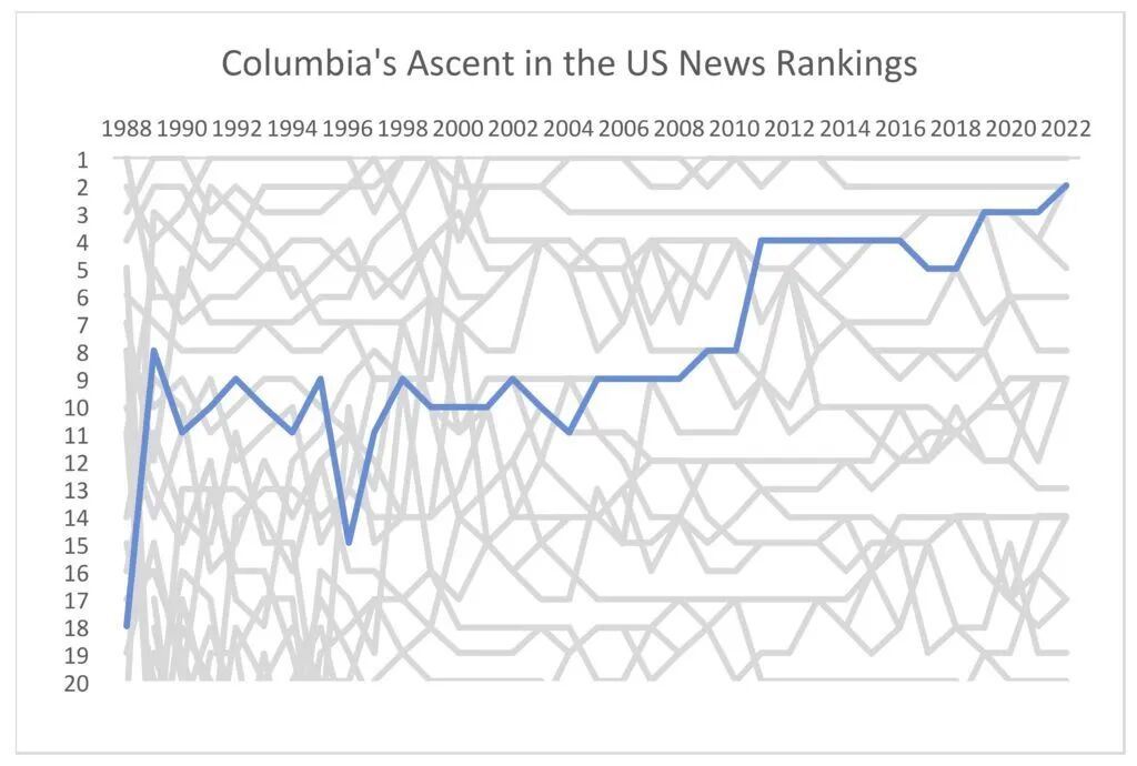 哥伦比亚大学在 U.S. News 排名中的上升轨迹(1988–2022)。2021 年达到历史最高第 2 位,但随后的数据丑闻引发巨大争议。