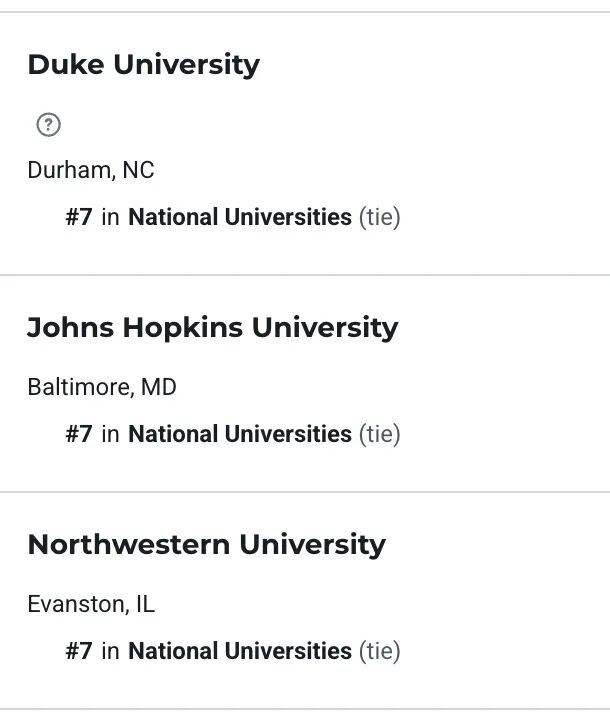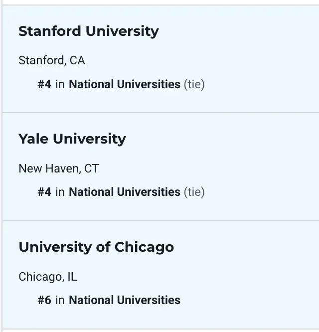 斯坦福和耶鲁并列第 4,芝加哥大学跌至第 6,而杜克、约翰斯・霍普金斯、西北和宾大并列第 7,格局趋向胶着。